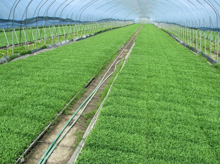 ハウスで育てられている水稲の苗。外気にならし中です。